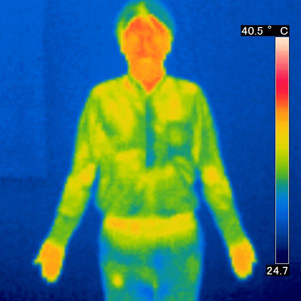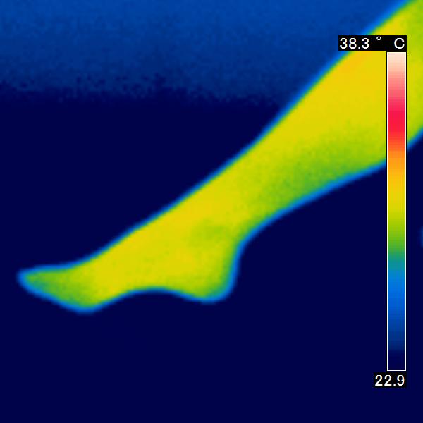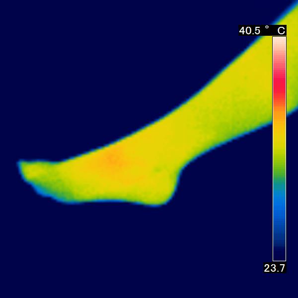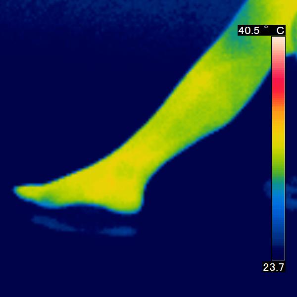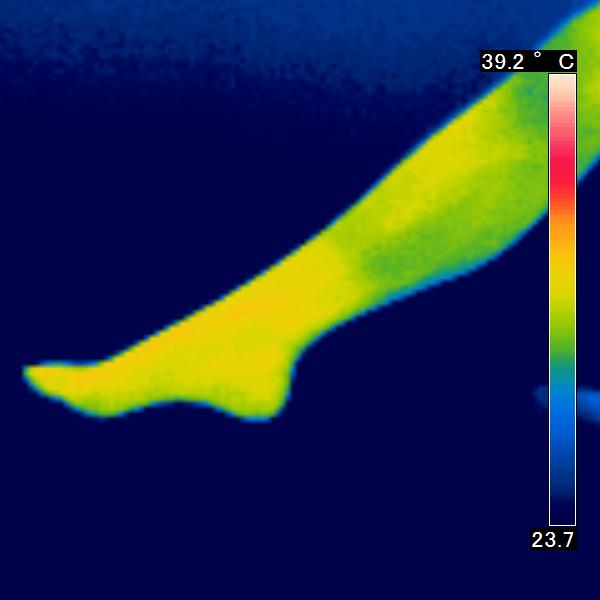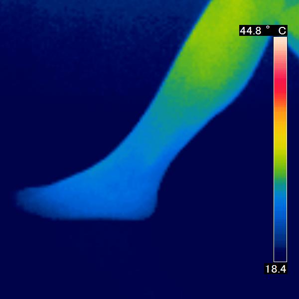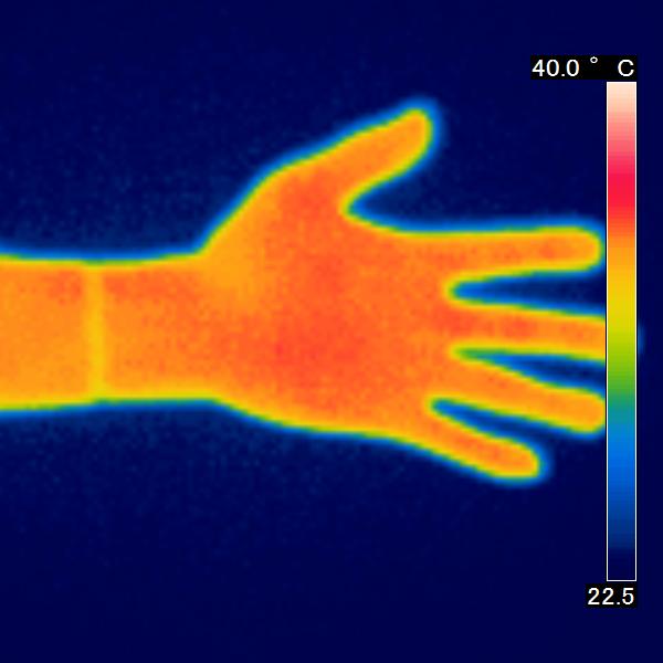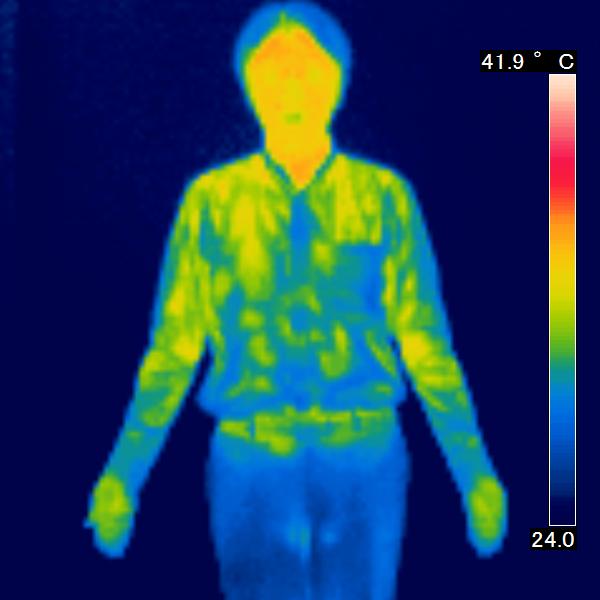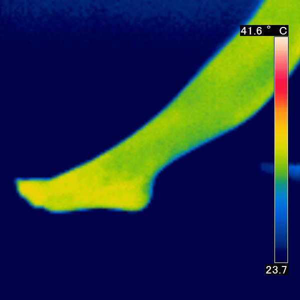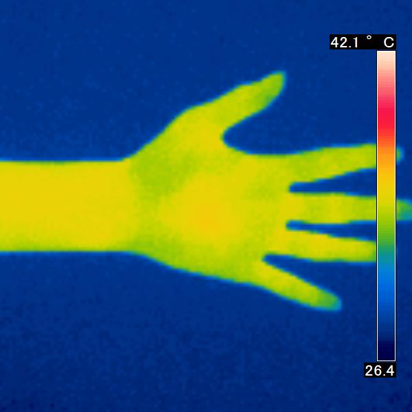 サーモグラフィを使用し、皮膚の表面から出ている赤外線を感知し、皮膚の表面温度の写真を撮りました。コスモビサが放射する遠赤外線効果で皮膚温は上昇し、 赤く表示されます。